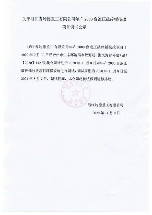 浙江嶺德重工有限公司年產(chǎn) 2000臺液壓破碎錘項目竣工環(huán)境保護驗收公示